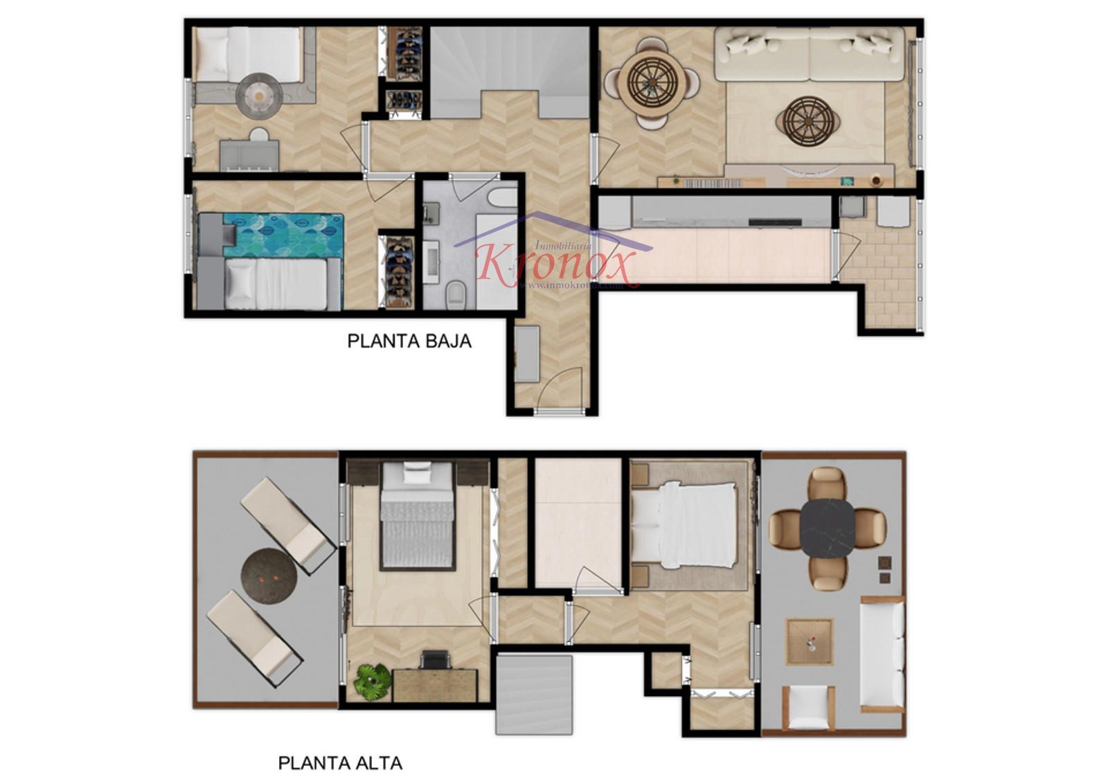 En la planta superior se encuentran otros dos dormitorios, cada uno con salida directa a su propia terraza, además de un segundo baño con bañera de hidromasaje.